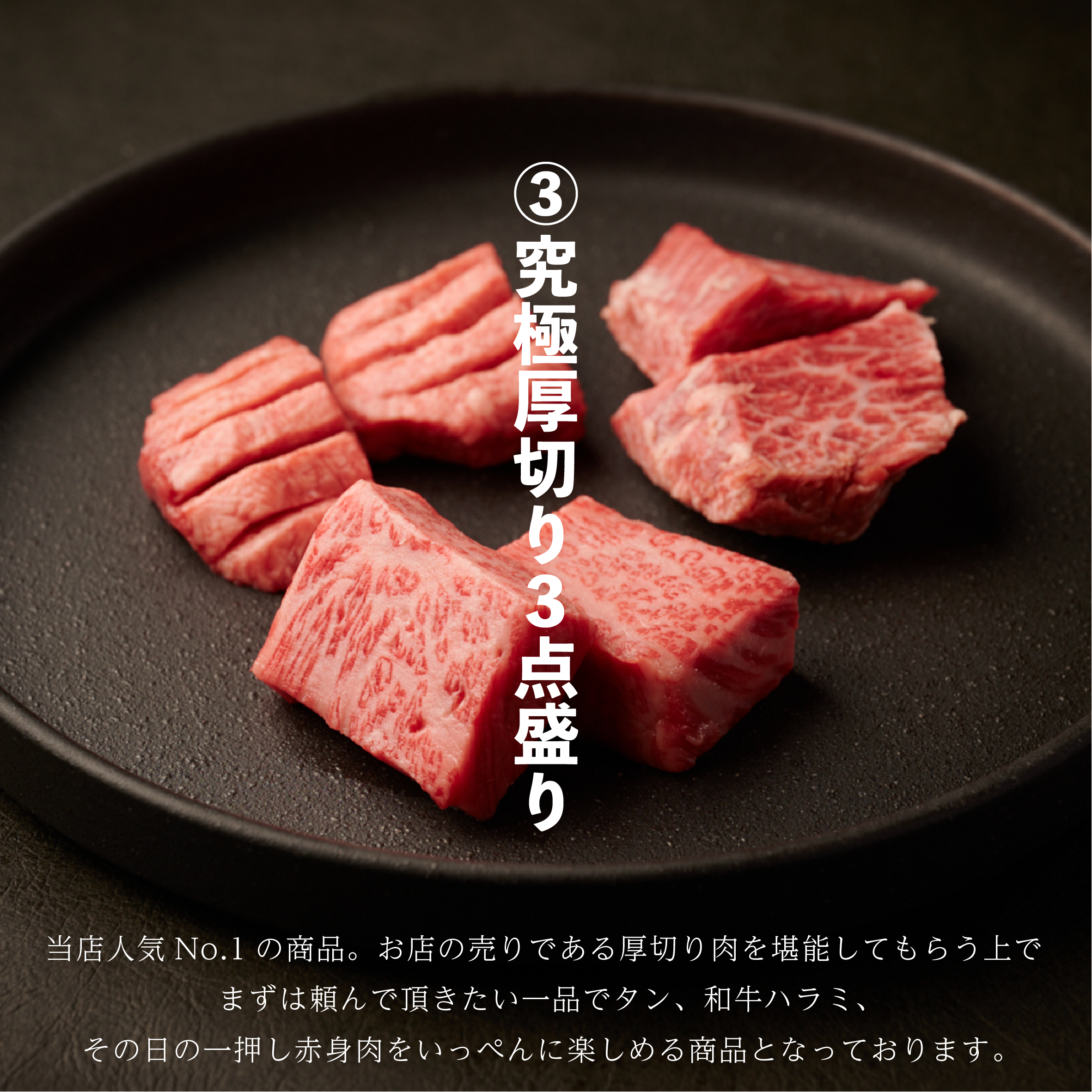 『当店人気No.1の商品。お店の売りである厚切り肉を堪能してもらう上でまずは頼んで頂きたい一品でタン、和牛ハラミ、その日の一押し赤身肉をいっぺんに楽しめる商品となっております。』